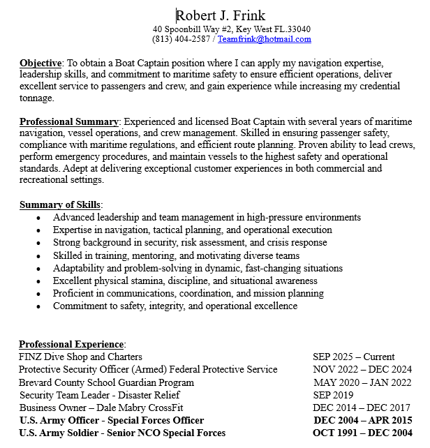 Boat Captain based in Key West with 23 years in U.S. Military Special Operations. Skilled in navigation, safety, and crew leadership. Passionate about the ocean, delivering exceptional guest experiences, and operating vessels with professionalism, precision, and integrity.